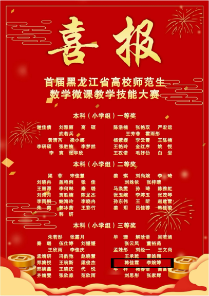 近日,首届黑龙江省高校师范生数学教学技能大赛在哈尔滨师范大学松北校区圆满落幕。教育学院2023级小学教育二班韩佳霖、李婉婷两位同学组成团队参赛,凭借创意十足的系列微课设计与多元化呈现形式,在“数学微课设计大赛”小学组中脱颖而出,荣获三等奖,为我校再添荣誉。