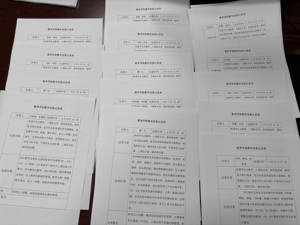 每次巡查后,巡查组及时整理《教学巡查记录表》,系统梳理“学生出勤整齐、课堂抬头率高、教师教学资料完备”等亮点,并对“个别学生注意力不足”等问题进行分类归档,建立清晰的巡查台账。该记录既为教师优化课堂管理提供依据,也为学院常态化教学监督积累了数据支撑。
