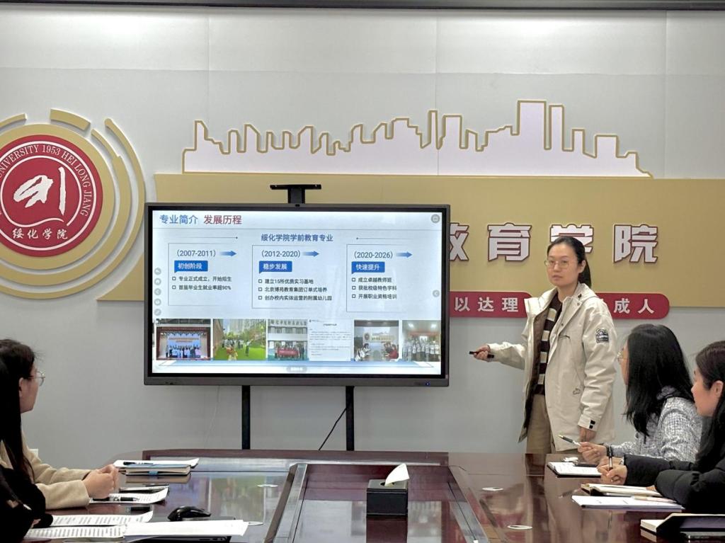 在答辩环节,学前教育专业负责人刘妍结合师范类专业认证专家反馈的意见,详细介绍如何将认证理念全面融入新方案,特别是在持续改进机制、实践教学体系以及体现学前教育最新理念等方面所做的调整,确保人才培养方案更加科学、规范,符合认证标准要求。