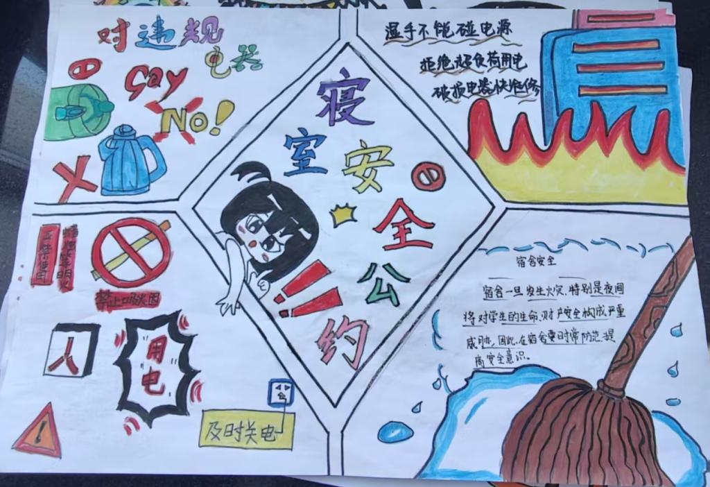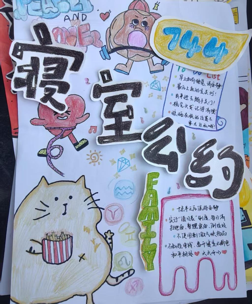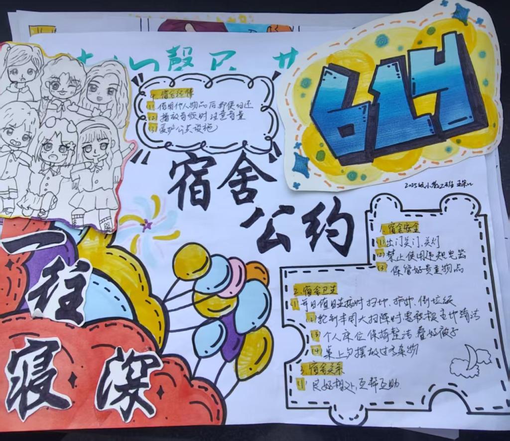 寝室公约设计活动中,各寝室以学校学生公寓管理相关规定为基础,充分结合寝室成员的共性特点展开创作。大家围绕寝室学风、安全、卫生、作息、生活习惯和兴趣爱好等方面深入讨论,将共识转化为具体行动方案:既涵盖互助学习计划以浓厚学风,也明确安全用电细则以筑牢防线,更规划卫生值日表与集体兴趣活动以规范日常、凝聚活力,最终凝练出具有本寝室独特风格的文明公约,传递出积极向上的集体氛围。