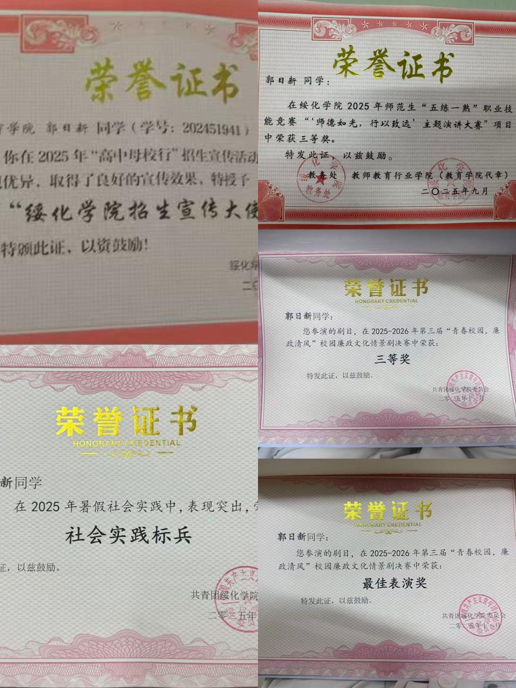 郭日新,女,汉族,共青团员,教育学院24级学前教育专业一班学生,现任24级学前教育一班团支书。在校期间,她始终勤奋笃学、全面发展,斩获2024-2025学年国家励志奖学金、校级二等综合奖学金,先后获评“省级三好学生”“社会实践标兵”“绥化学院招生宣传大使”等荣誉称号;在专业能力与综合素质提升上表现突出,荣获绥化学院2025年师范生“五练一熟”职业技能竞赛主题演讲大赛三等奖、校园廉政文化情景剧决赛最佳表演奖。