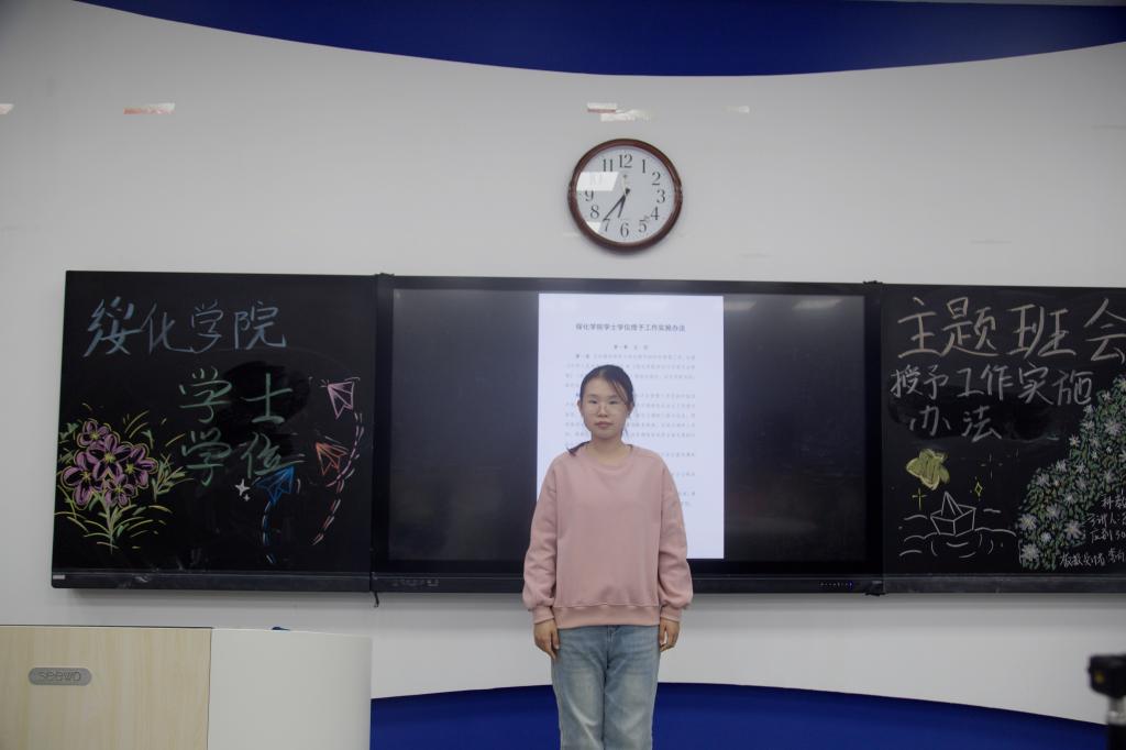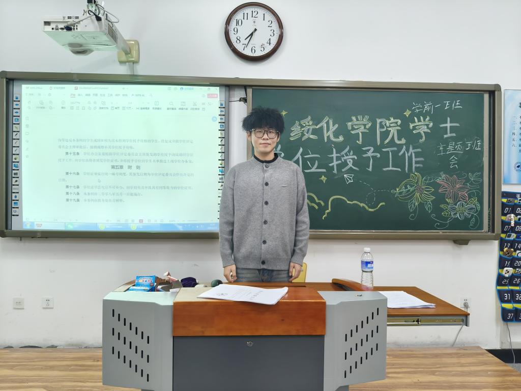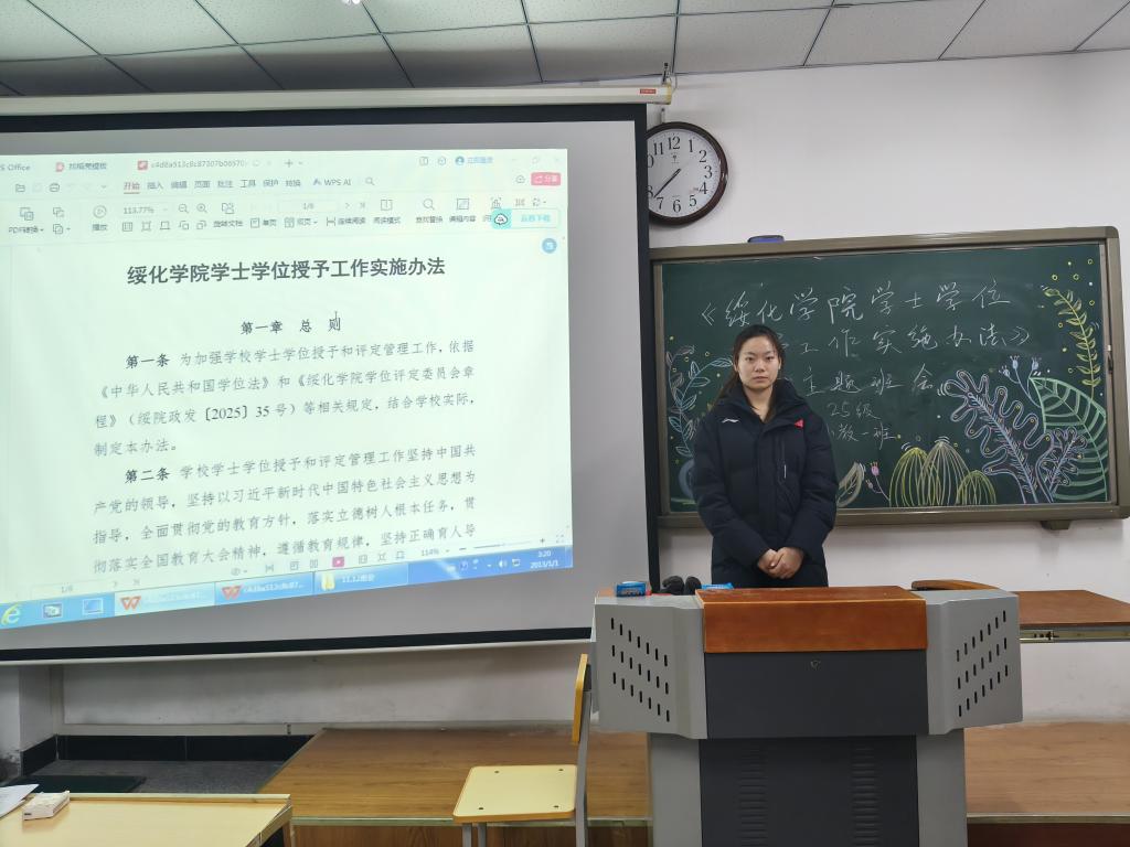 班会上,各班班长围绕《绥化学院学位授予条例》核心内容展开讲解,重点说明学士学位授予的基本条件、不同学科门类的绩点要求,以及补授学位的适用情况,同时简要介绍学位评定的主要流程。此外,还特别提醒同学们对照条例梳理自身学业进度,提前排查并规避影响学位获取的潜在风险,助力大家清晰方向,为顺利获取学士学位做好充分规划。