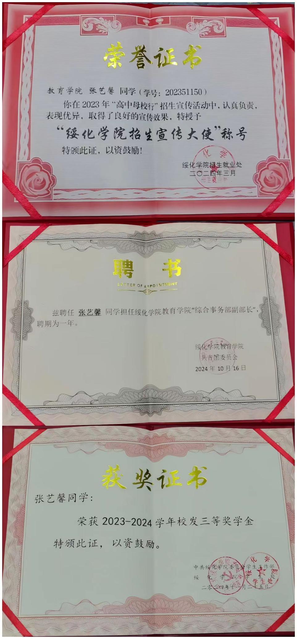 张艺馨,女,汉族,2005年11月生,共青团员,教育学院2023级学前教育专业一班学生。入学以来,她始终以严格的标准要求自己,荣获2023-2024学年校级三等综合奖学金、2024-2025学年校级二等综合奖学金、2024-2025学年国家励志奖学金;获得“绥化学院招生宣传大使”称号。
