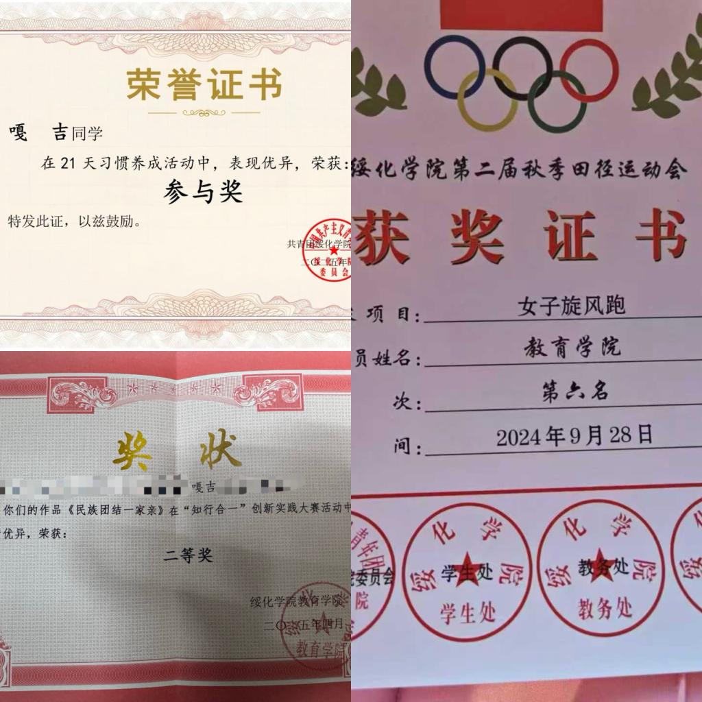 嘎吉,女,藏族,共青团员,教育学院2024级学前教育专业一班学生。大学期间,她成绩优异、全面发展,先后斩获2024-2025学年国家励志奖学金、校级二等综合奖学金,荣获“知行合一”创新实践大赛二等奖,绥化学院第二届秋季田径运动会中女子组旋风跑项目第六名,“21天行为习惯养成计划”参与奖。