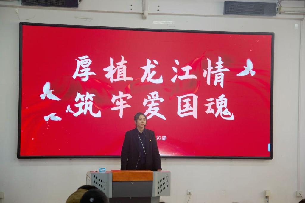 活动开始,黄静聚焦爱国主义的历史厚度与时代温度,围绕“明内涵、辨方向、践行动”三个角度,将国家情怀融入教育教学全过程,为同学们筑牢思想根基,助力龙江教育振兴。同时通过主题分享的形式,串联中华传统爱国精神与龙江抗联、北大荒等红色记忆,构建“三位一体”育人体系,深刻阐述新时代爱国主义,引导同学们明晰爱国不是空洞的口号,而是融入日常学习、投身家乡建设的实际行动。