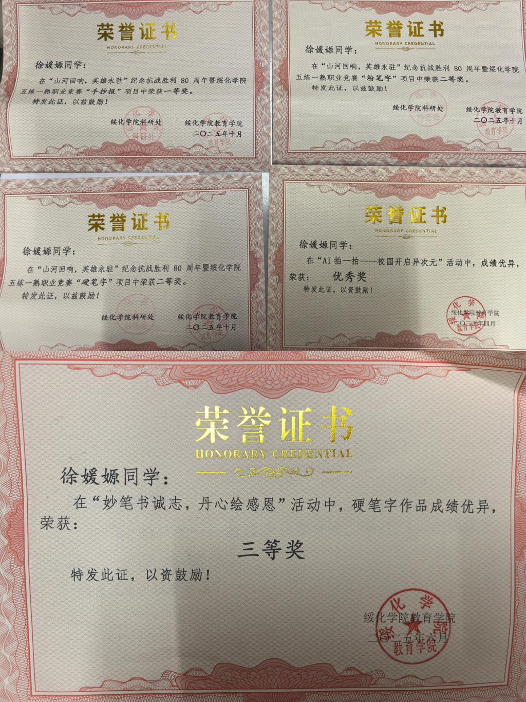 徐媛嫄,女,汉族,教育学院2024级小学教育专业学生,她在校期间勤奋好学,荣获2024-2025年度国家励志奖学金、2024-2025年度校级综合三等奖学金,2025年师范生“五练一熟”职业技能竞赛手抄报制作一等奖、粉笔字二等奖、硬笔字二等奖。
