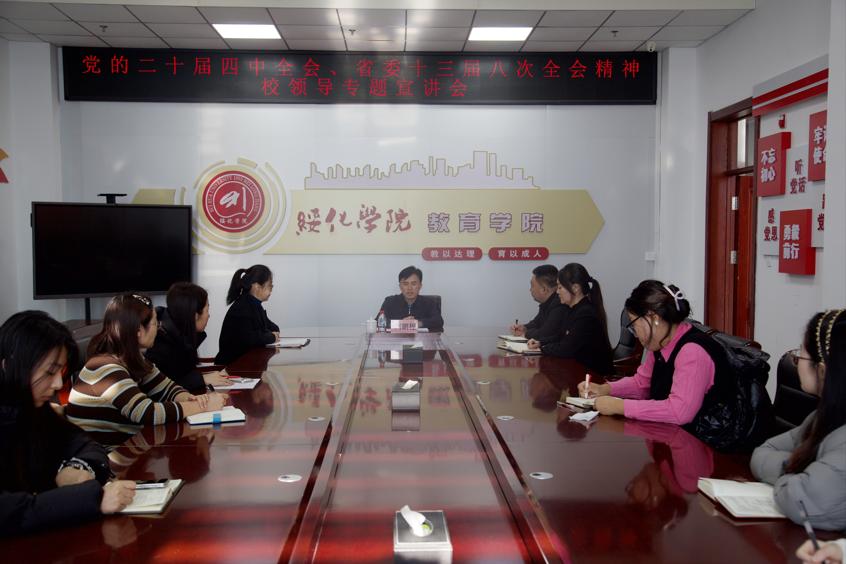 11月21日,绥化学院副院长刘鹏程于崇德楼320会议室开展党的二十届四中全会、省委十三届八次全会精神校领导专题宣讲会,以专题宣讲凝聚思想共识、推动精神落地。此次宣讲会由教育学院党总支书记曹广志主持,教育学院师生代表参会。