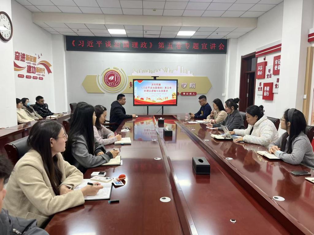 围绕《习近平谈治国理政》第五卷,王瑞院长着重指出了中国式现代化构建起兼具国内治理深度与全球视野的严密体系,以党的全面领导和自我革命为根本保障,是习近平新时代中国特色社会主义思想的最新结晶。结合教育事业使命,王瑞院长向全体教师发出号召:要深耕理论转化实践的路径探索,将《习近平谈治国理政》第五卷中的思想精髓深度融入课堂教学创新与科研攻坚全过程,为培育时代新人注入实践动能。