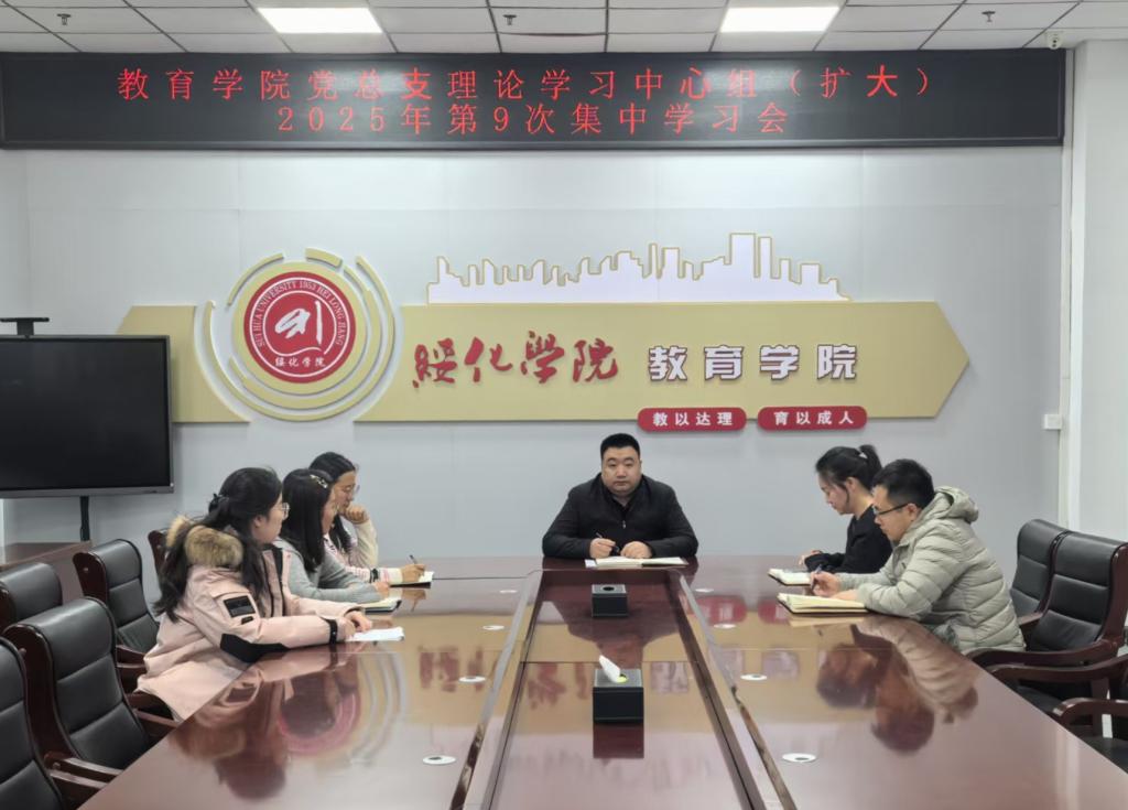 12月10日,教育学院于崇德楼320会议室召开党总支理论学习中心组(扩大)2025年第9次集中学习会。教育学院党总支书记曹广志主持会议并讲话。党总支理论学习中心组成员黄静、刘妍、韩影、李恒参加学习,教育学院院长周姊毓、第二学生党支部书记张蔆奥列席会议。