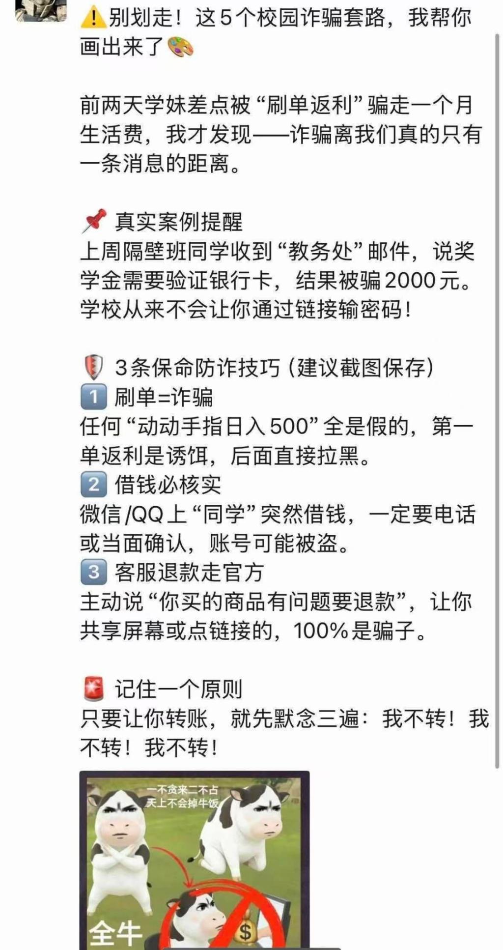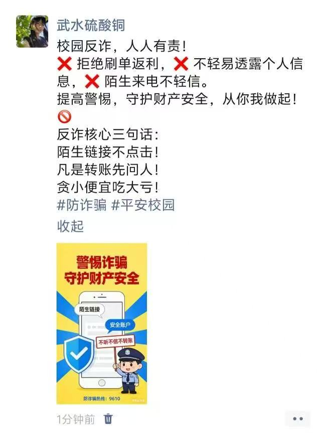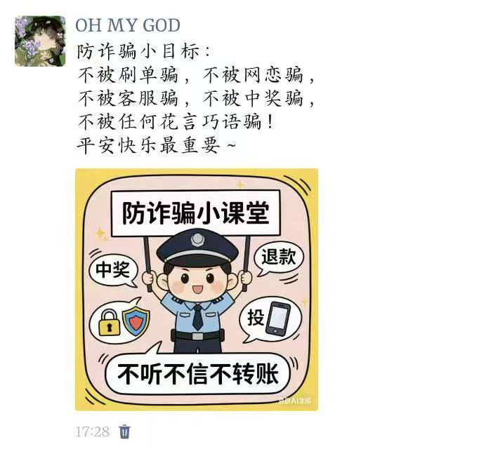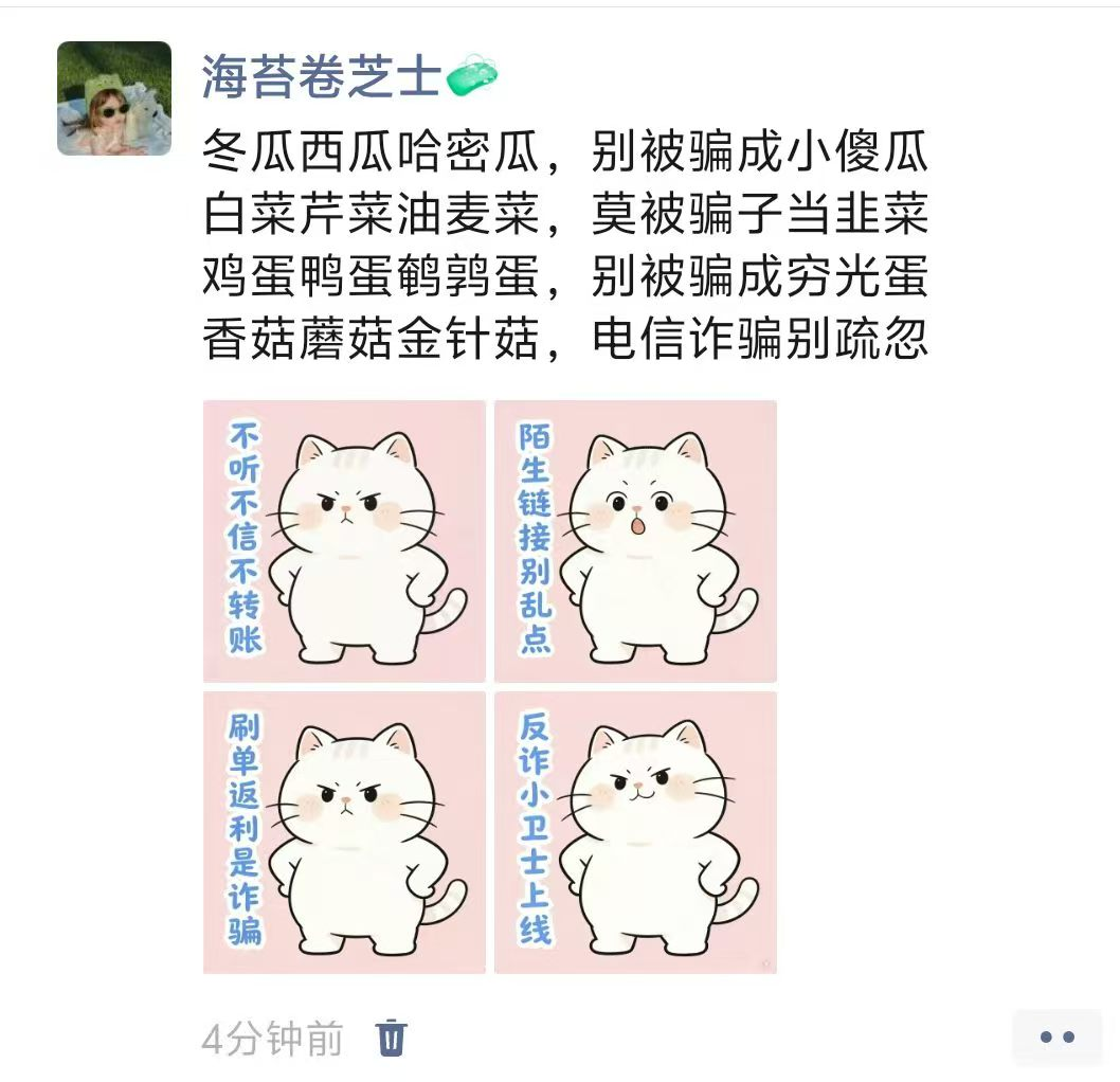 活动期间,我院全体学生积极参加。他们将趣味文字、卡通形象与警示标语融入表情包设计,让反诈知识以更易传播的形式走进日常;同时,朋友圈宣传内容结合真实案例,以兼具知识性与引导性的文案传递反诈理念,带动身边同学共同增强防范意识。