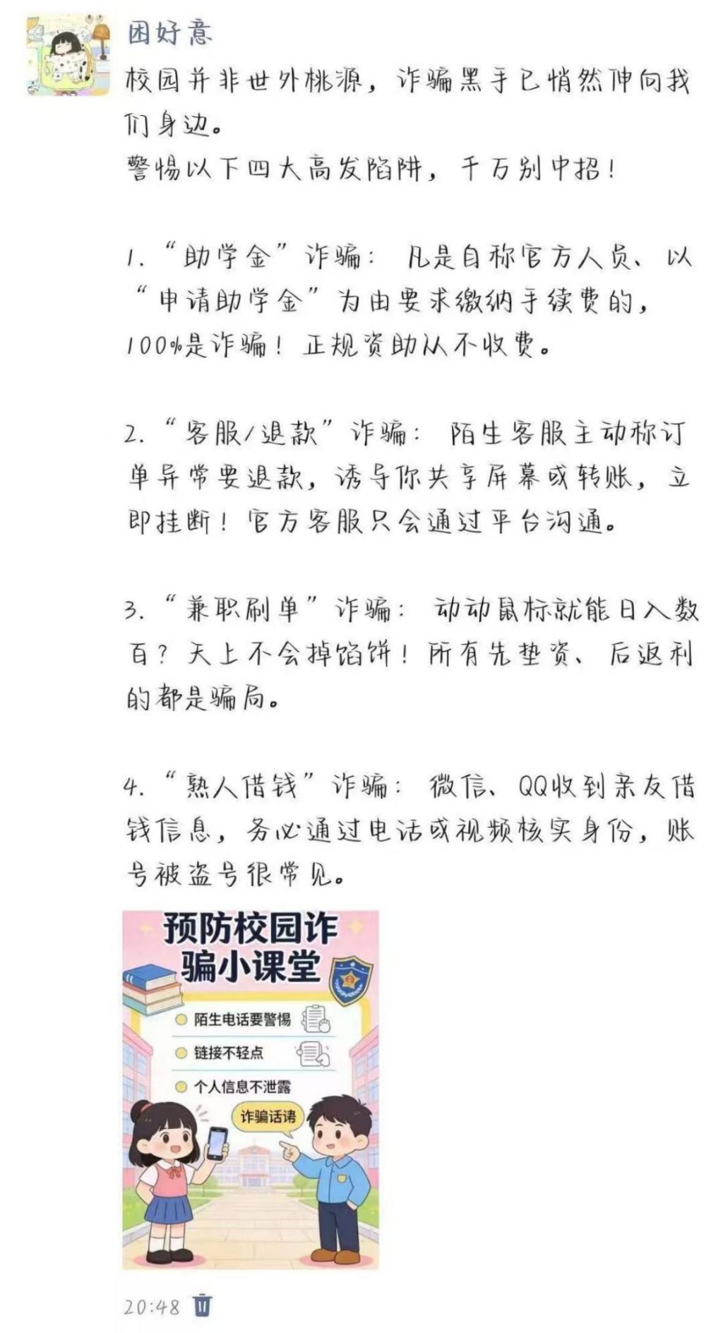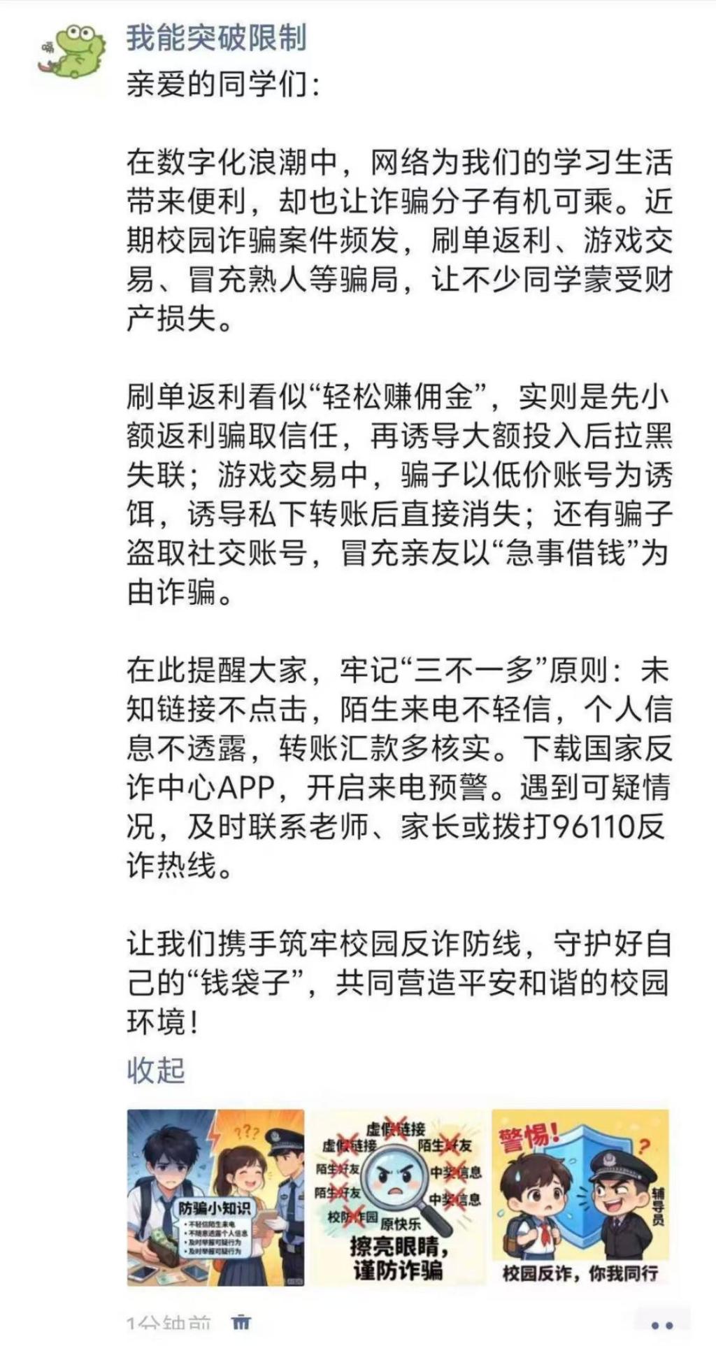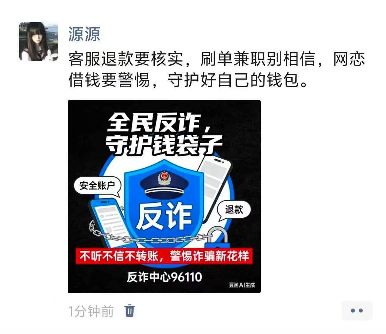 活动期间,我院全体学生积极参加。他们将趣味文字、卡通形象与警示标语融入表情包设计,让反诈知识以更易传播的形式走进日常;同时,朋友圈宣传内容结合真实案例,以兼具知识性与引导性的文案传递反诈理念,带动身边同学共同增强防范意识。