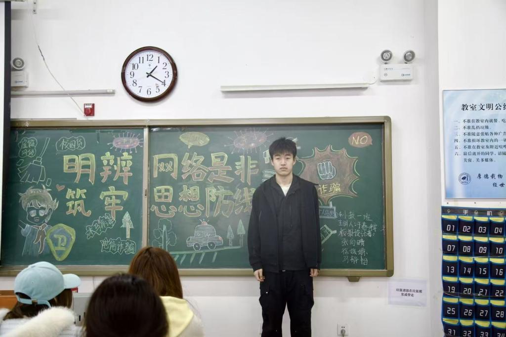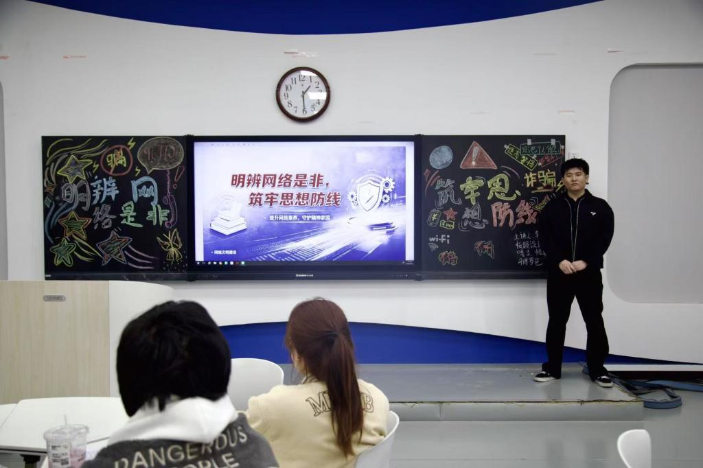 各班班长围绕网络意识形态安全、网络文明规范、网络安全法治和个人风险自查四大模块开展主题班会:深入解读网络意识形态工作的重要意义,深刻剖析不良思潮的现实危害,引导学生明辨是非、坚定立场;明确网络言行边界,倡导理性发声、文明表达,坚决杜绝造谣传谣与网络非理性行为;结合典型案例普及网络安全知识与相关法律法规,破除网络无约束、无底线的错误认知,强化全体学生的法治敬畏之心;引导学生对照自查上网习惯、排查自身行为隐患,主动远离不良信息与各类网络非法活动,全面提升自我防护与风险规避能力。