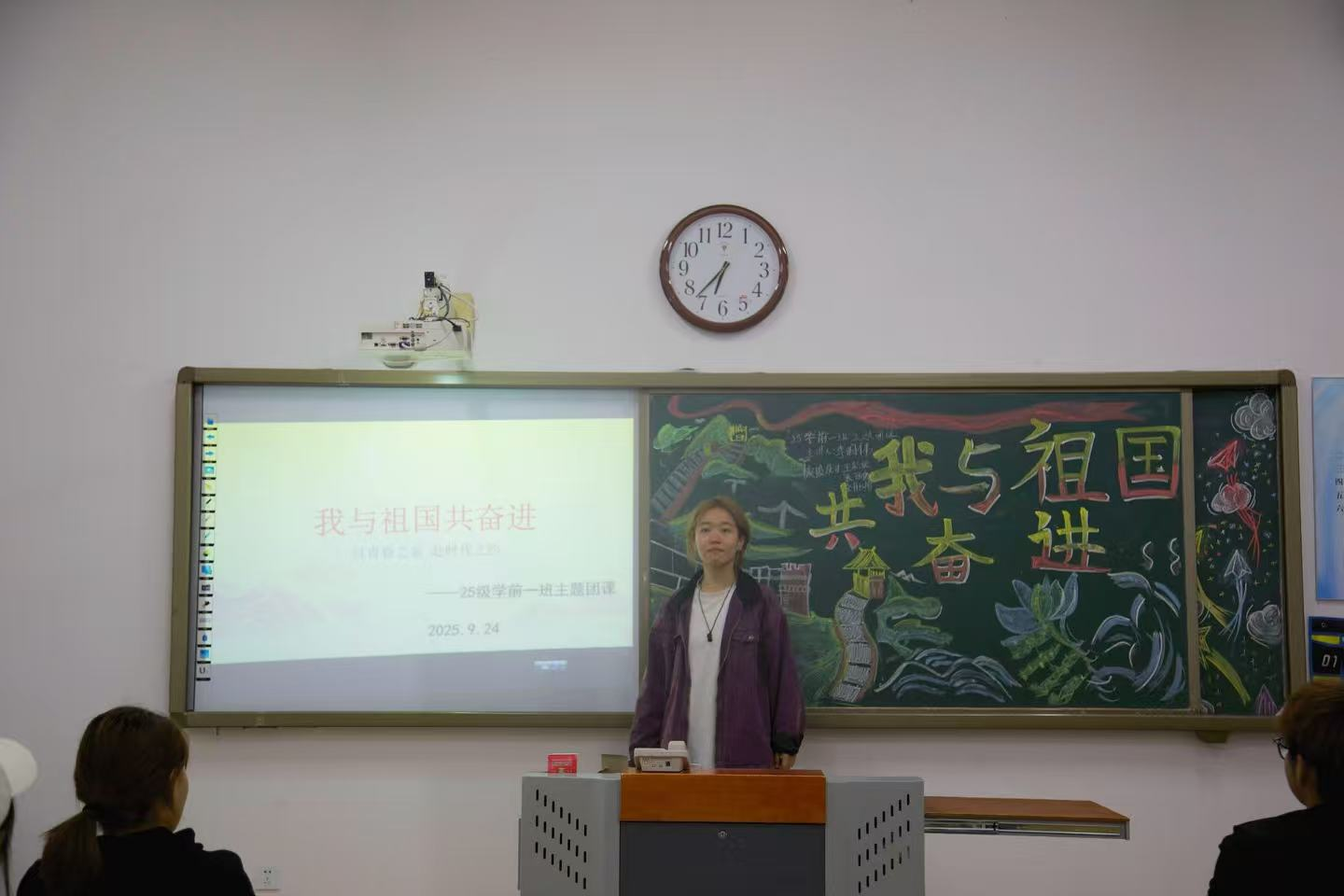 活动中,各班团支书带领同学们回顾了祖国在教育普惠、乡村振兴、科技发展等方面取得的重大成就,深入解读“青年成长与国家命运紧密相连”的时代内涵,引导大家认识到“奋进”不仅是个人追求,更是时代赋予青年的责任与使命。在交流分享环节,同学们踊跃发言,纷纷表示从祖国的发展进程中深切感受到个人成长与国家命运的同频共振。作为教育专业的学子,未来将会扎根教育一线,将青春奉献给祖国最需要的教育岗位,以实际行动践行“与祖国共奋进”的誓言。