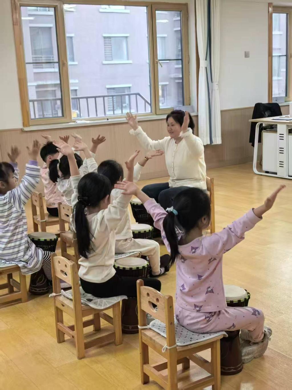 志愿者以鼓为媒,先示范标准坐姿与握槌方式开启韵律启蒙,引导孩子们在“咚—哒—咚”的节奏叩击中建立身体与音乐的联结;随即融入“鼓点传花”游戏,让鼓点起伏与花朵传递相映成趣,孩子们在专注中深化节奏感知。集体合奏时,孩子们的小手随明快音乐起落敲击,稚嫩鼓点交织成灵动乐章,在彼此呼应的韵律中沉浸式体验音乐协作之美。